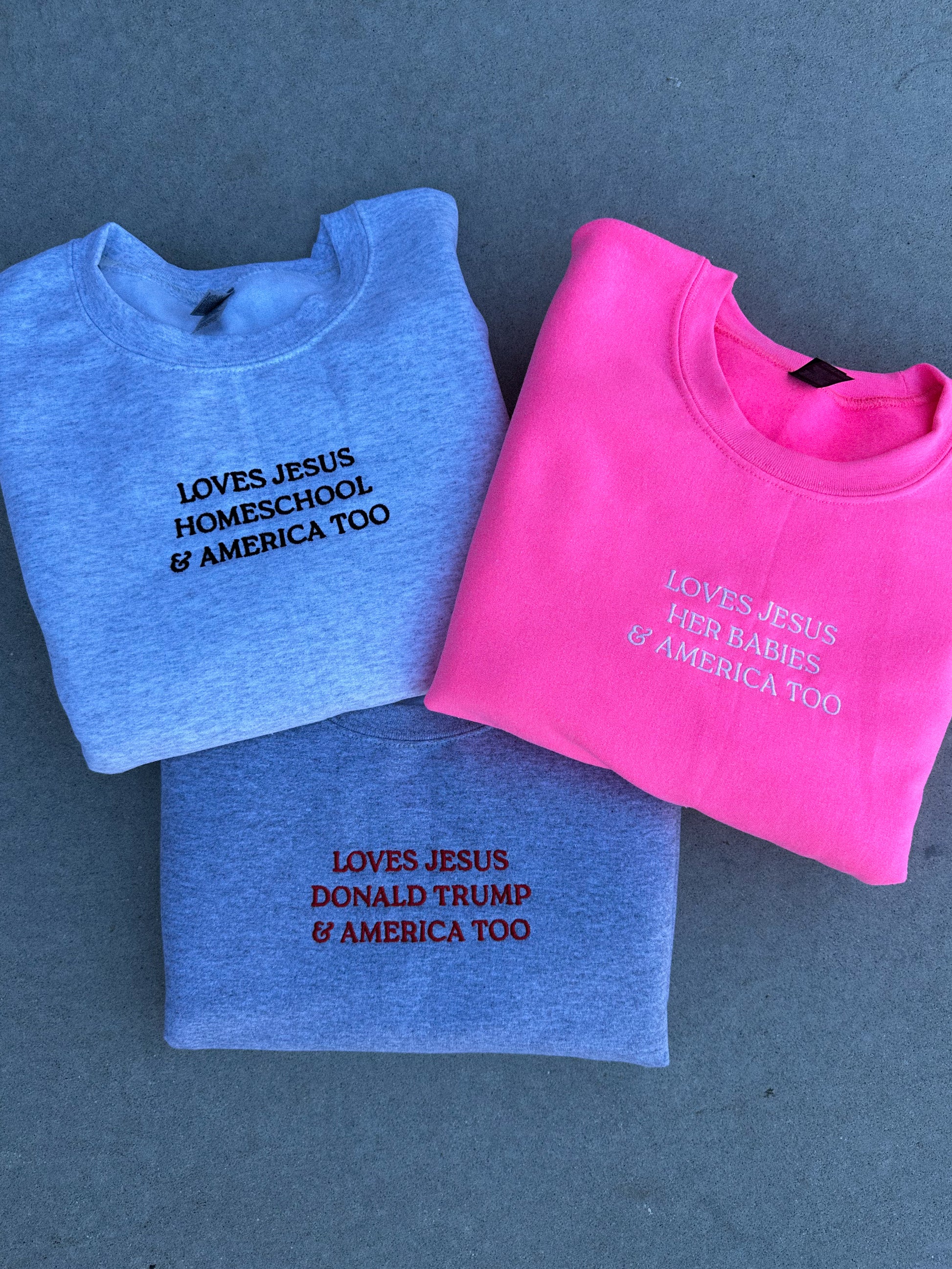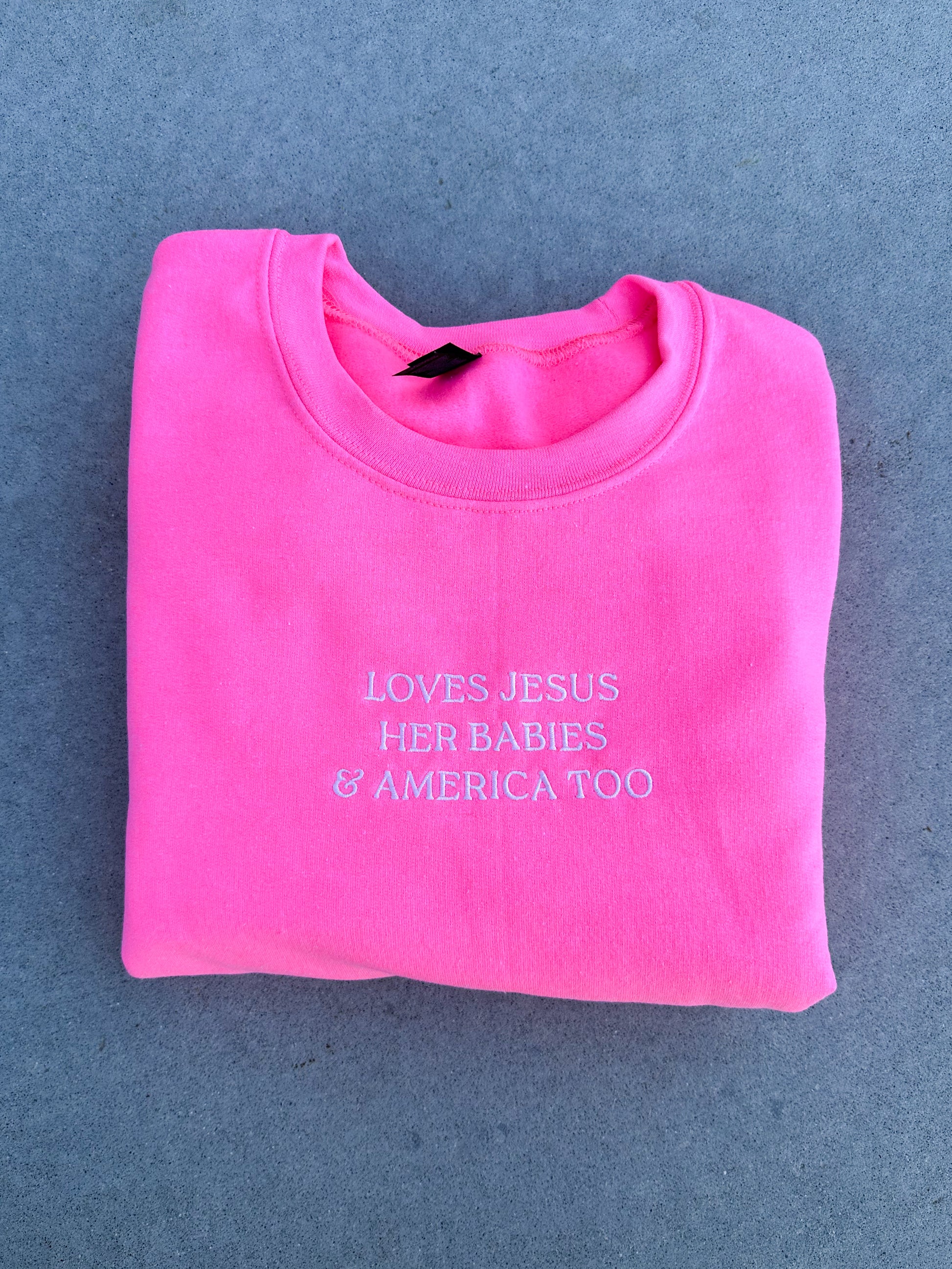 LOVES JESUS, “HER BABIES” & AMERICA, TOO - EMBROIDERED REGULAR CREWNECK