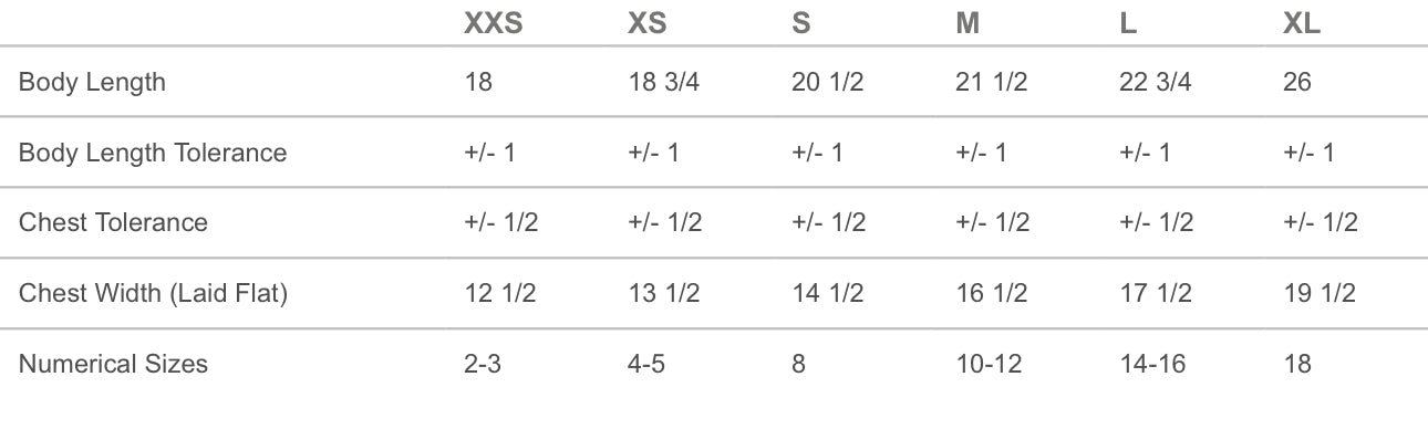 XXS 2-3, XS 4-5, S 6-8, M 10-12, L 14-16